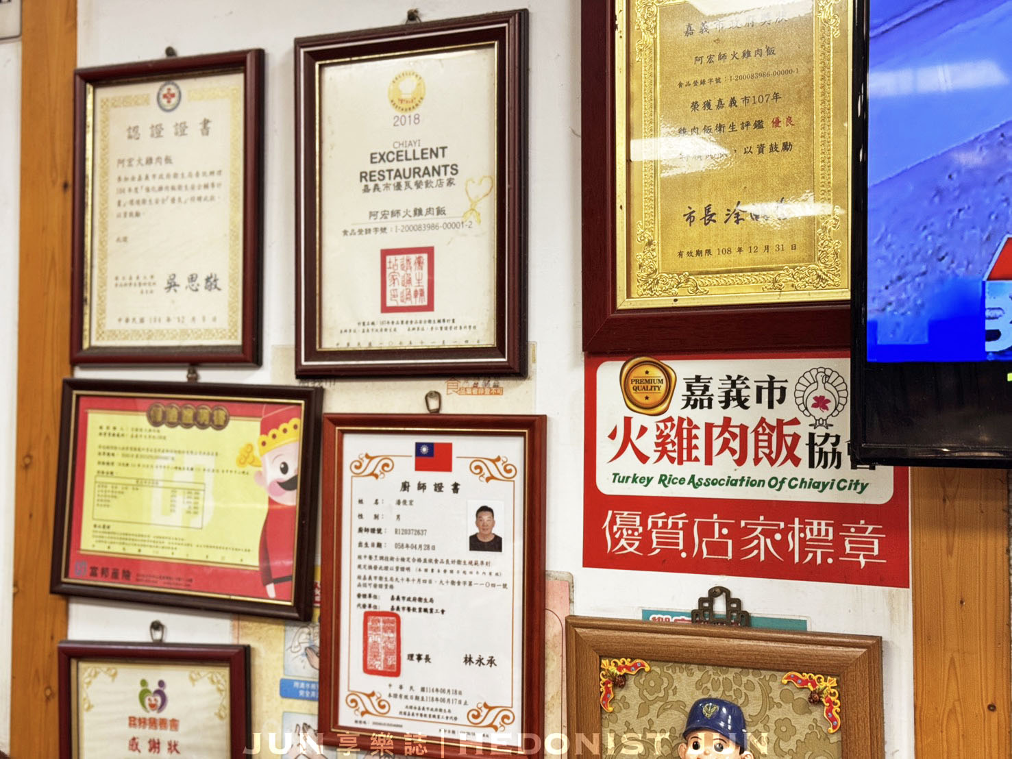 開業40多年的「阿宏師火雞肉飯(光華總店)」,牆上滿滿名人簽名及各種獎章、認證,不愧是嘉義雞肉飯名店。