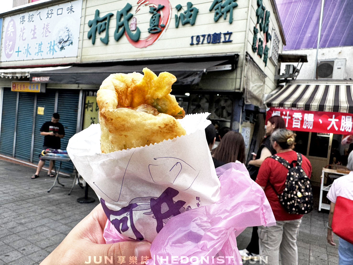 總算拿到我的蔥油餅,剛起鍋的那一刻,油香撲鼻而來,手上沉甸甸、燒燙燙的,正是傳說中的「柯氏蔥油餅」。