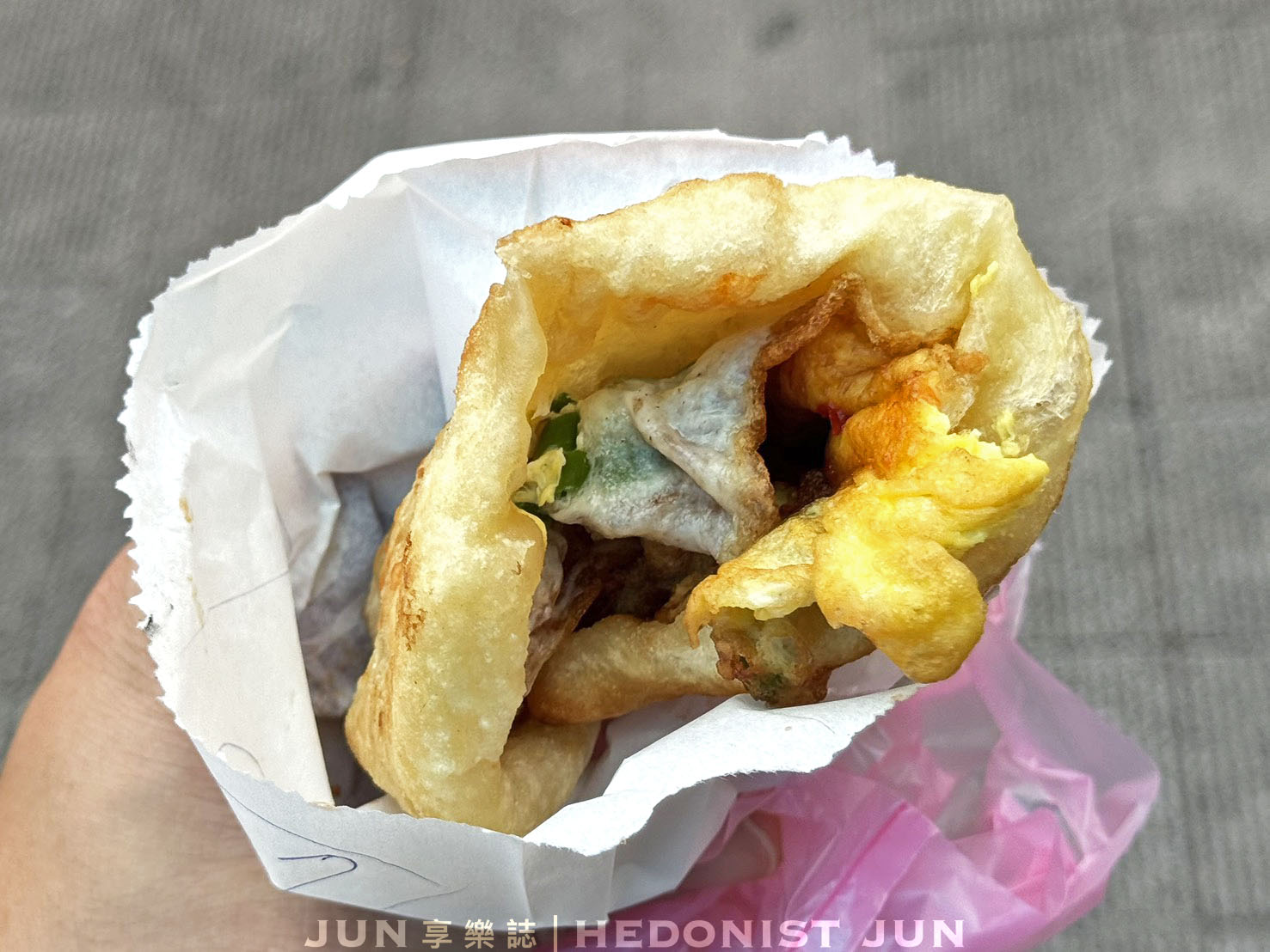 這不是那種乾扁的蔥油餅,而是餅皮鼓起、層層藏著空氣,外酥內Q,裡頭包的是滿滿三星青蔥拌著蔥花蛋,看起來就讓人食指大動。