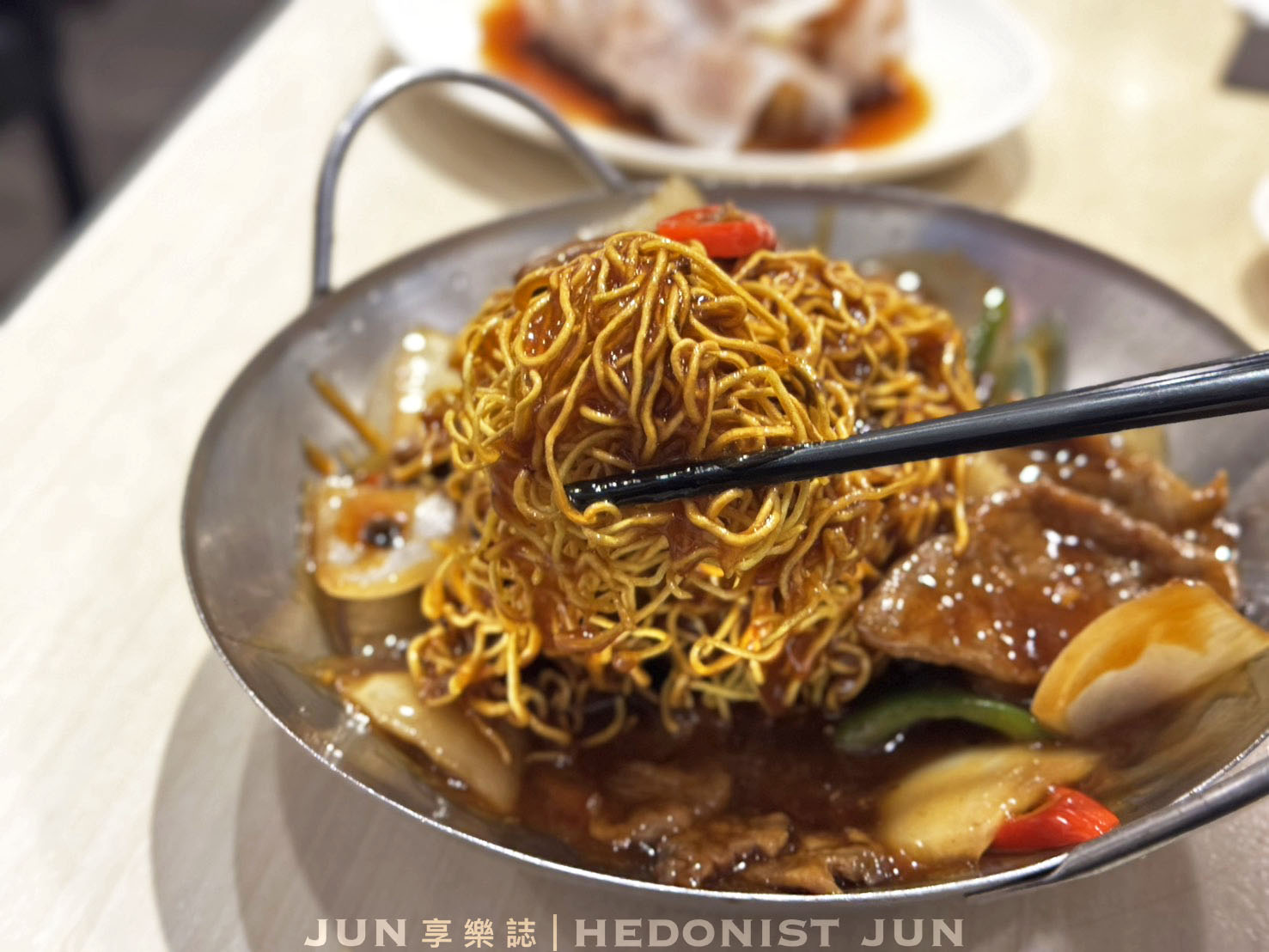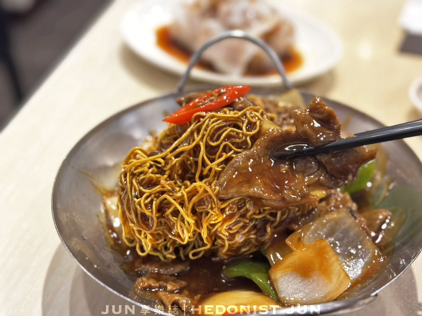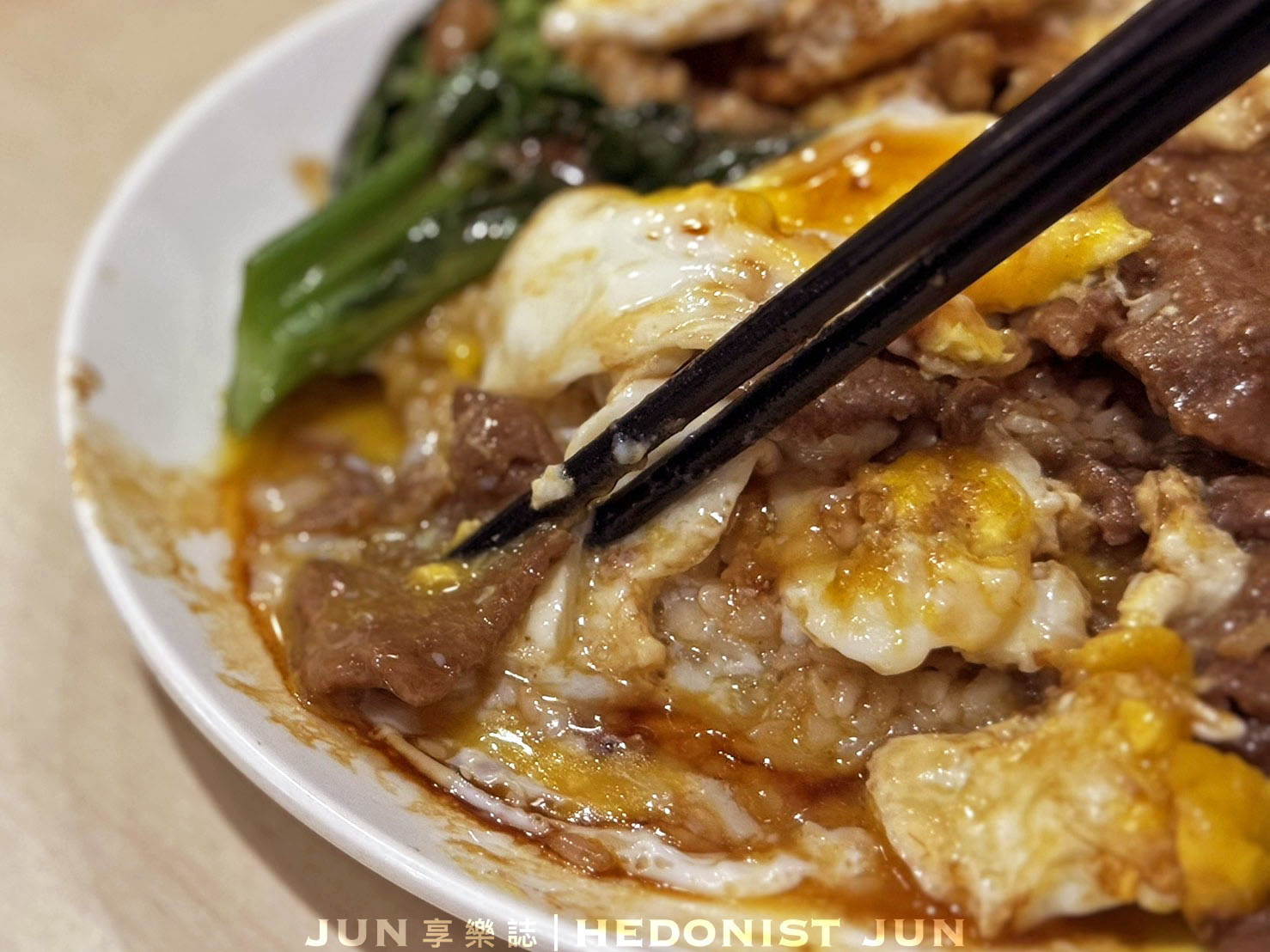 軟嫩牛肉與鹹甜豉汁澆頭,賦予這盤廣炒麵靈魂,「茗香園冰室」味道處理得恰到好處。
