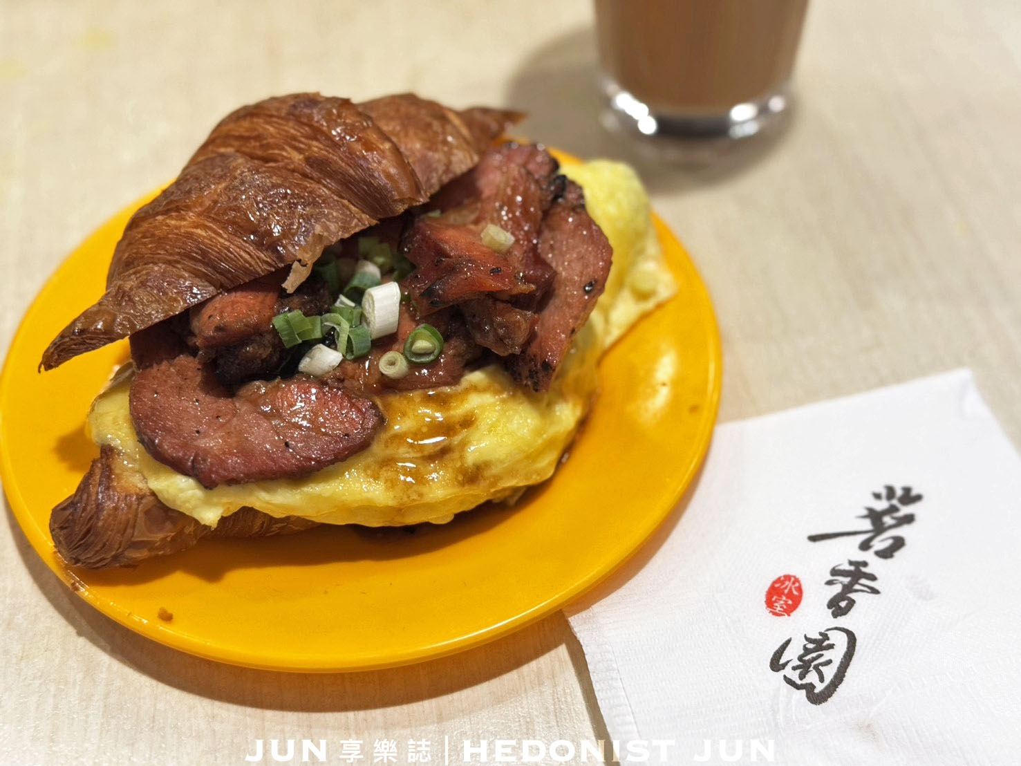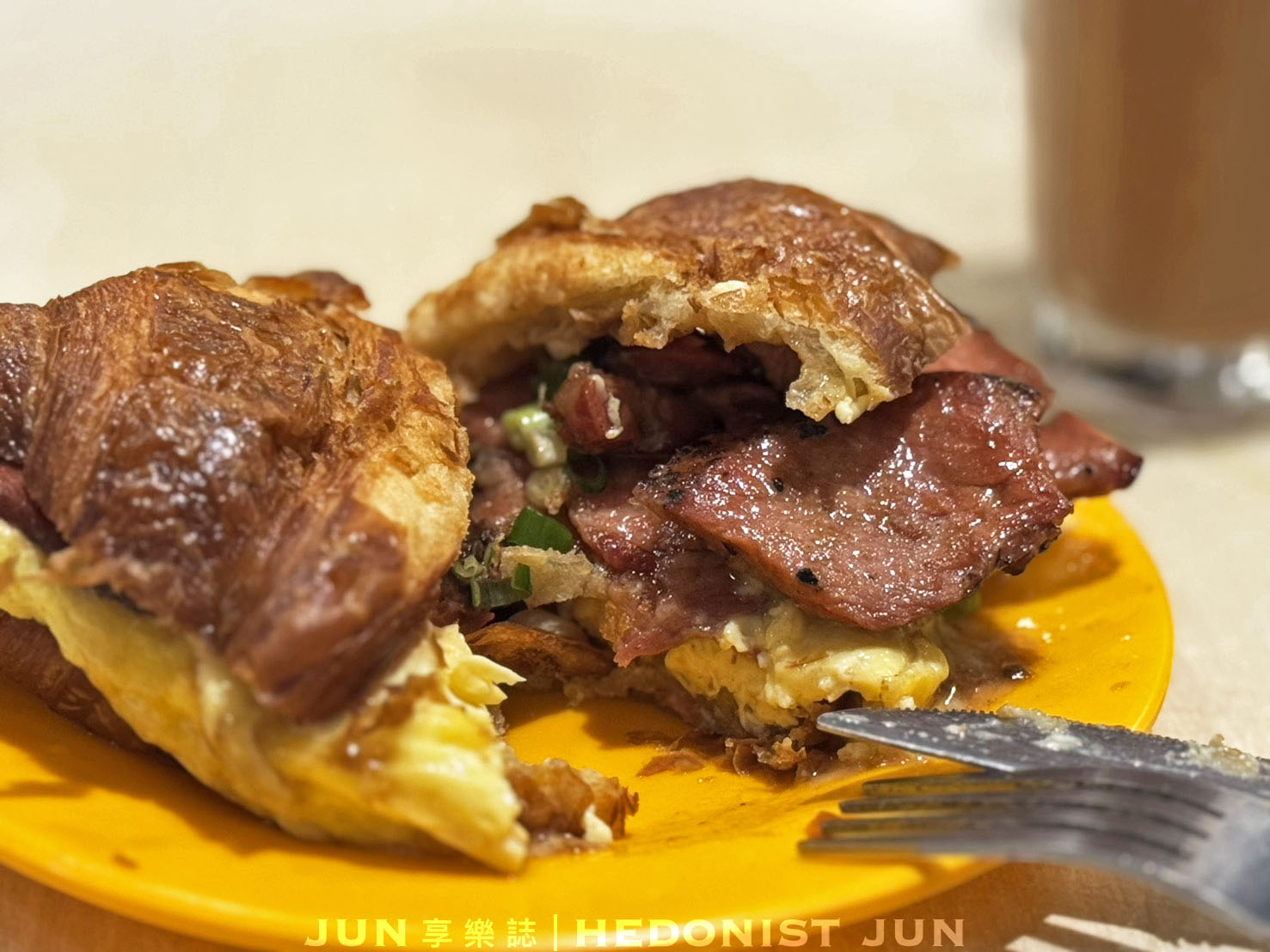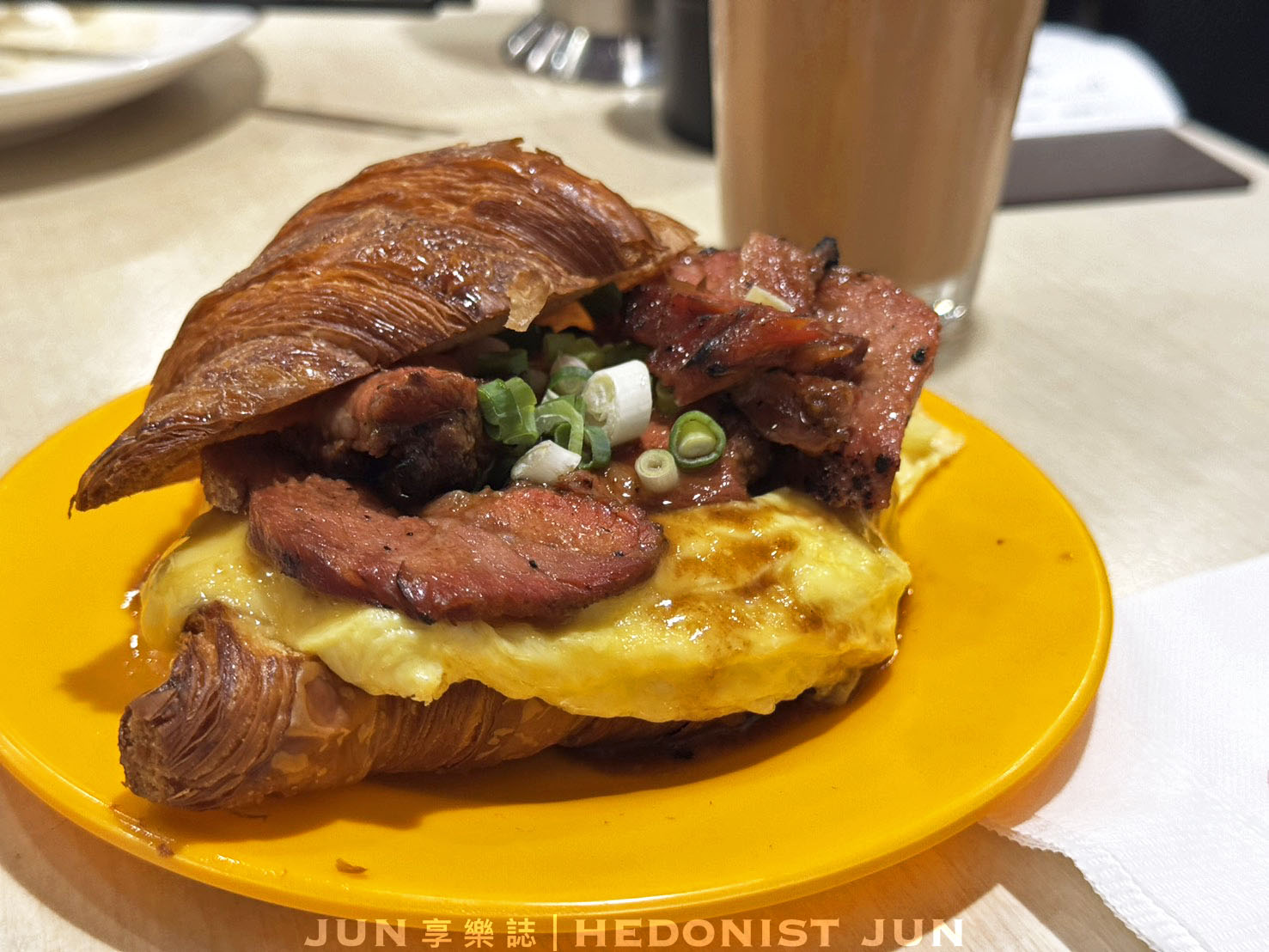 港式美食真的都好邪惡,像「茗香園冰室」這顆滑蛋叉燒可頌,一看就覺得完了,吃完體重機又要跟我抗議了,可頌一顆就很肥了,還加上奶油滑蛋和叉燒,那還得了。