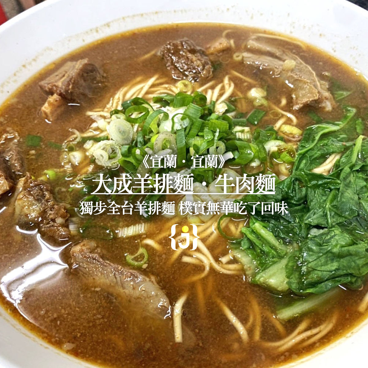宜蘭火車站前,有一間獨步全台的羊排麵-大成羊排麵,雖然店面樸實無華且隱身在巷子內,卻無人不知無人不曉,濃醇湯頭與鮮嫩羊排讓上門老饕一訪再訪,曾獲宜蘭百大美食名店第二名,不只宜蘭人,就連外縣市愛好者吃過都回味無窮。