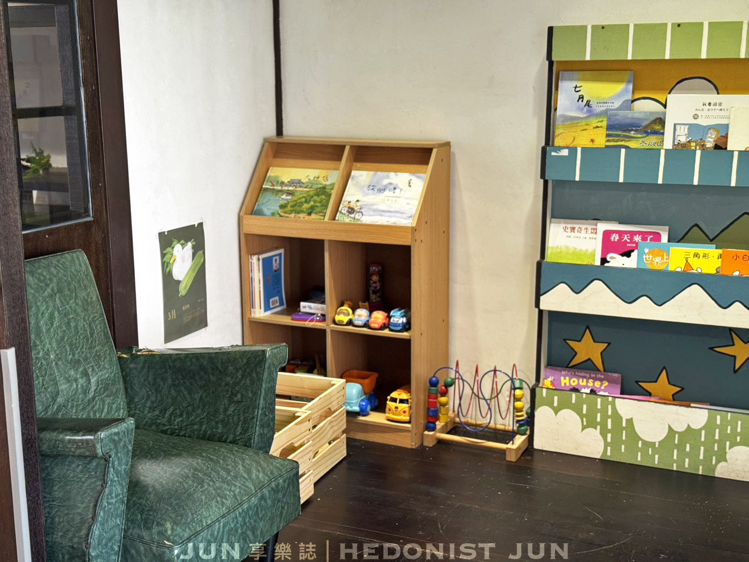 原來竟是兒童嬉戲區,有著玩具和繪本童書,體貼帶小孩造訪的爸媽。