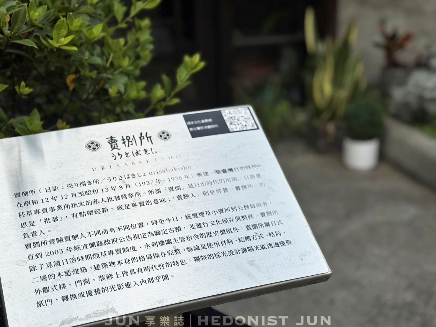 「賣捌所 Urisabakisho」這個可愛的名字,日文意思其實是「專賣店」,以前這是煙草專賣私人營業所,近百年來經歷幾個不同功能,因為保存完整兼具時代美感,2003年經宜蘭縣政府公告為縣定古蹟,定名為「舊宜蘭菸酒賣捌所」,由縣府文化局取得管理權後修繕、招商。